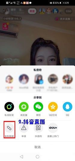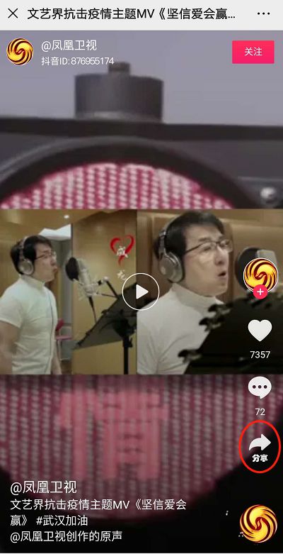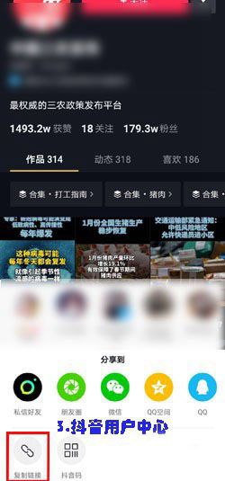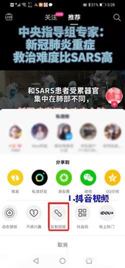 抖音視頻頁:從抖音APP中復(fù)制鏈接,如下圖紅色方框1點(diǎn)擊右上方三個(gè)點(diǎn)后點(diǎn)復(fù)制鏈接即可。