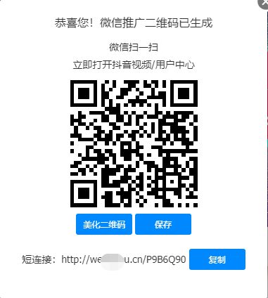 從瀏覽器進(jìn)入微信跳轉(zhuǎn)抖音轉(zhuǎn)換工具-微跳抖,。在輸入框里輸入抖音鏈接,點(diǎn)擊轉(zhuǎn)換網(wǎng)址之后,就會(huì)看到底部生成了自己的抖音賬號的二維碼和短鏈接了,支持抖音視頻頁,抖音用戶中心頁和目前大火的抖音直播的轉(zhuǎn)換。