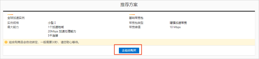 您可以根據(jù)系統(tǒng)推薦的購買方案,組合購買業(yè)務(wù)所需要的全球加速實例和基礎(chǔ)帶寬包。