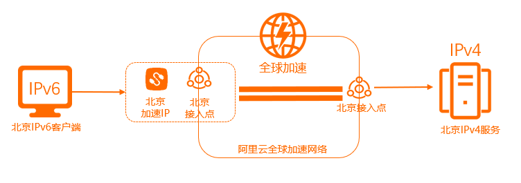 加速區(qū)域添加成功后,全球加速會為接入地域分配一個可公網(wǎng)訪問的IPv6地址作為加速IP,IPv6客戶端通過該加速IP訪問后端IPv4 Web服務(wù)。