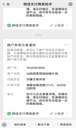 若您已經(jīng)關(guān)注【微信支付商家助手】公眾號(hào),平臺(tái)會(huì)通過(guò)公眾號(hào)通知該商戶號(hào)違約處理操作,商戶可點(diǎn)擊通知跳轉(zhuǎn)至詳情頁(yè)面,進(jìn)行相關(guān)記錄的查詢及處理。