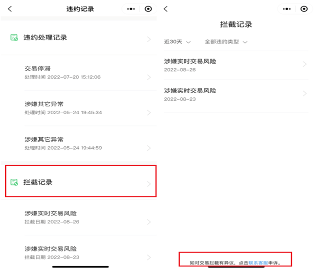 查詢路徑:【微信支付商家助手】小程序->點(diǎn)擊首頁(yè)風(fēng)險(xiǎn)處理->攔截記錄