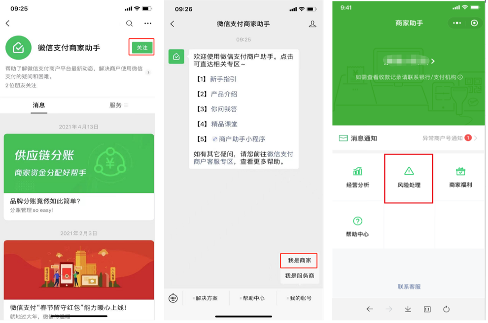 請(qǐng)按以下路徑查看違約處理記錄: 關(guān)注【微信支付商家助手】公眾號(hào)->我的賬號(hào)->我是商家-> 風(fēng)險(xiǎn)處理
