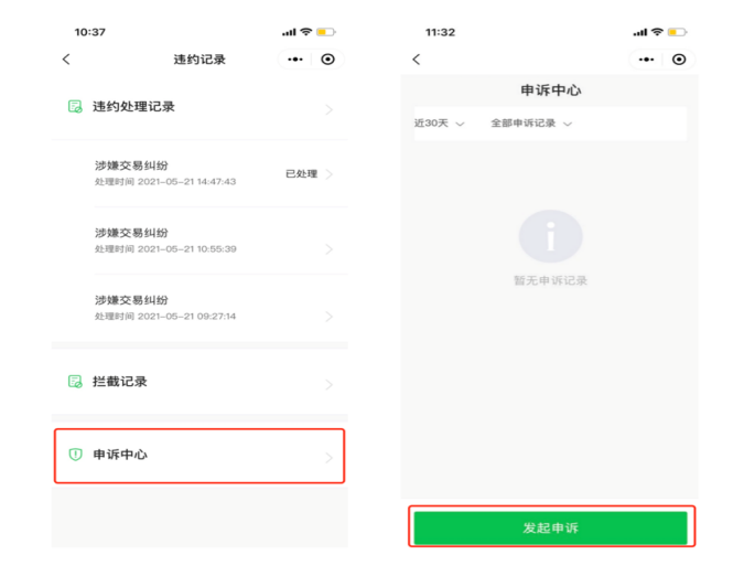 4、如對(duì)違約記錄有異議,或者未在規(guī)定時(shí)間內(nèi)對(duì)違約記錄進(jìn)行處理,您可以在微信支付商家助手小程序->風(fēng)險(xiǎn)處理->申訴中心提交申訴。