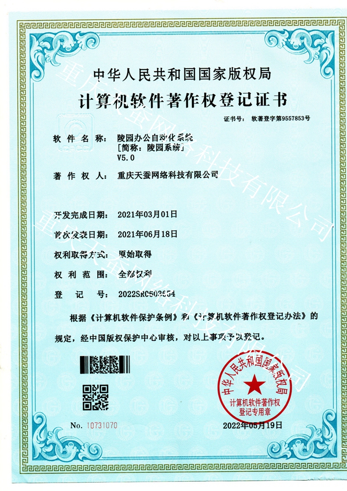 天蠶重慶軟件開發(fā)公司編者語:我司開發(fā)完成的自主知識(shí)產(chǎn)權(quán)“陵園辦公自動(dòng)化系統(tǒng) V5.0 簡稱‘陵園系統(tǒng)V5.0’ ”(英文:Cemetery Office Automation Manage System V5.0,簡寫COAMSV5.0:),陵園系統(tǒng)V5.0在2021年3月開始開發(fā),2021.6月開始發(fā)布,經(jīng)中華人民共和國國家版權(quán)局版權(quán)保護(hù)中心嚴(yán)格審核后,于2022年5月19日取得了《計(jì)算機(jī)軟件著作權(quán)登記證書》。