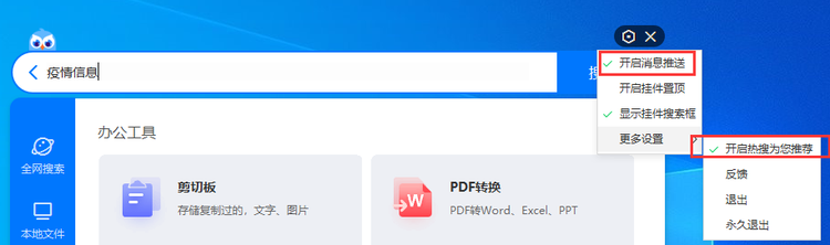在極速搜索右上角點擊設(shè)置按鈕—取消勾選“消息推送”,在更多設(shè)置中取消勾選“熱搜為您推薦”