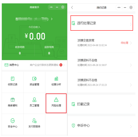 路徑:【微信支付商家助手】小程序->點(diǎn)擊首頁風(fēng)險(xiǎn)處理->違約處理記錄(待處理)